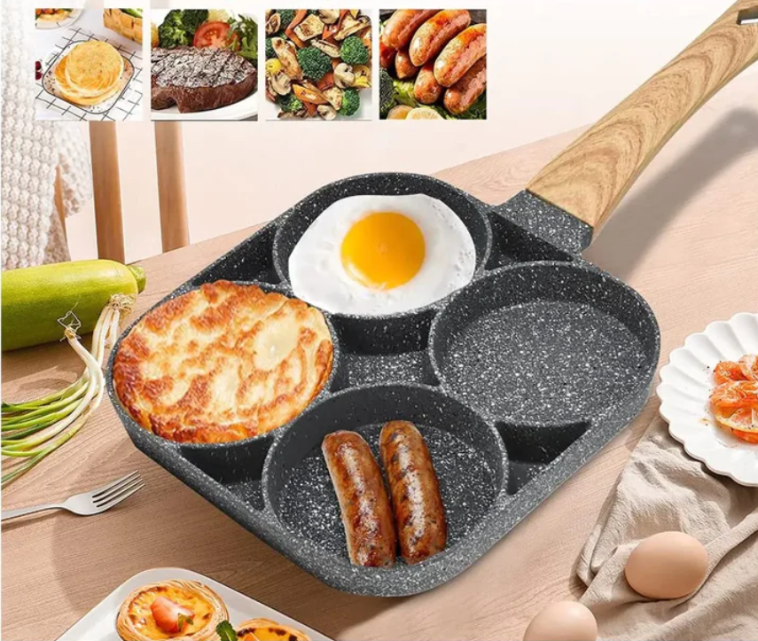 ¿Cansado de ensuciar múltiples ollas y sartenes mientras preparas tus comidas? ¡Nuestro Sartén de 4 Espacios es la solución ideal para ahorrar tiempo y energía en la cocina!
